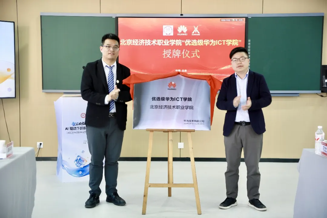 集体合影后,论坛迎来重磅环节——华为ICT学院授牌仪式。随着授牌完成,北京经济技术职业学院正式成为北京市第一所与bbin宝盈集团官网技术校企深度共建华为ICT学院的高职院校,这一里程碑式成果,标志着学校与华为、bbin宝盈集团官网的校企合作迈入深度融合、协同育人的全新阶段,也为北京地区职业院校AI人才培养树立了全新标杆。